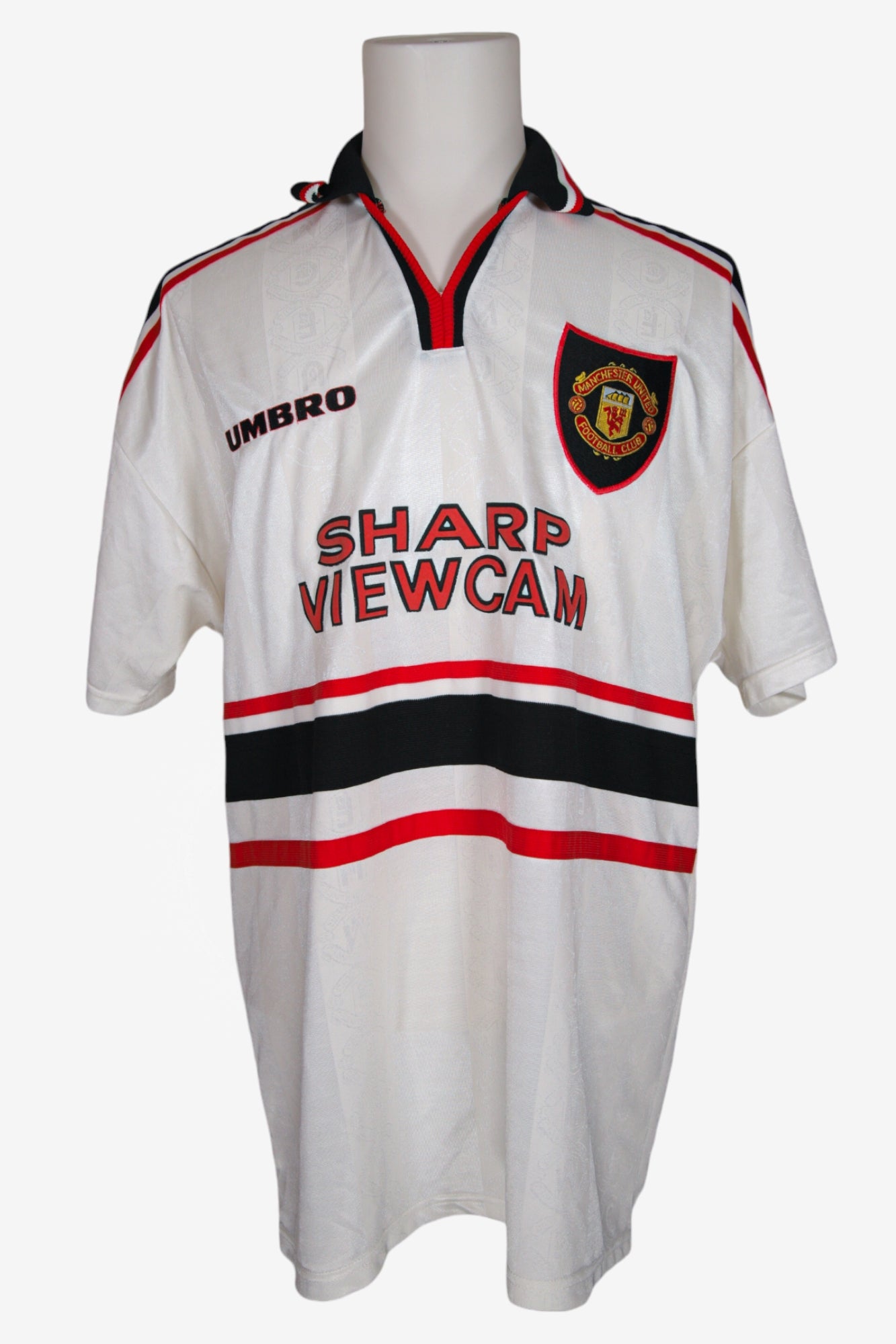 • Molto rara. Questa maglia, indossata nell'annata dello storico treble dei Diavoli Rossi, che riuscirono a conquistare per la prima volta nella storia di un club inglese, Premier League, FA Cup e Champion's League.